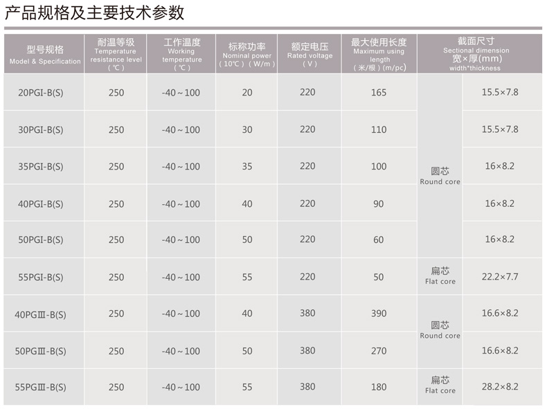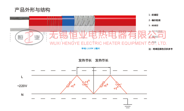 硅橡膠并聯(lián)式電熱帶的電源母線為二根或三根平行絕緣銅絞線, 在硅橡膠骨架層上纏繞P T C合金絲, 并將PTC合金電熱絲每隔一定距離相間交叉即“發(fā)熱節(jié)長"與母線連接,形成連續(xù)并聯(lián)電阻,母線通電后,各并聯(lián)電阻發(fā)熱,因而形成一條連續(xù)的電熱帶。硅橡膠并聯(lián)式電熱帶每米有一定標稱功率,使用的電熱帶越長,輸出的總功率越大,但由于采用PTC合金絲作為發(fā)熱元件,因此,其本身具有隨溫度變化而調(diào)節(jié)輸出功率的特性,且電熱帶采用硅橡膠作為絕緣材料,因此,帶體柔軟,便于安裝。該電熱帶在現(xiàn)場能按實際需要長度任意剪切。